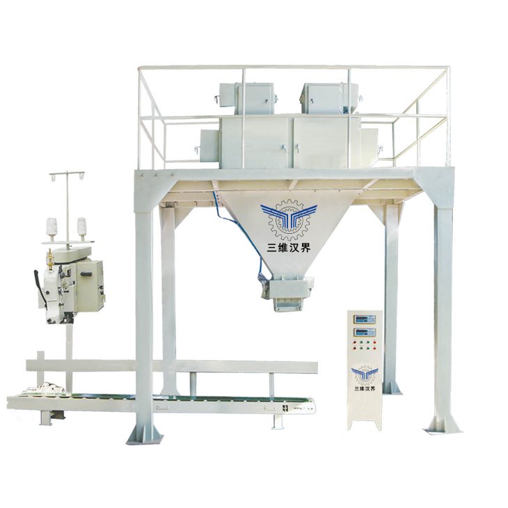 量后,给料机构停止给料,料仓关闭,采用重力给料的方式将称量斗内的物料灌装至包装袋内,灌装完毕后夹袋器自动打开,灌装好的包装袋自动落到输送机上,输送机向后输送至缝包机处,由人工辅助缝包,向后输出,完成包装过程。